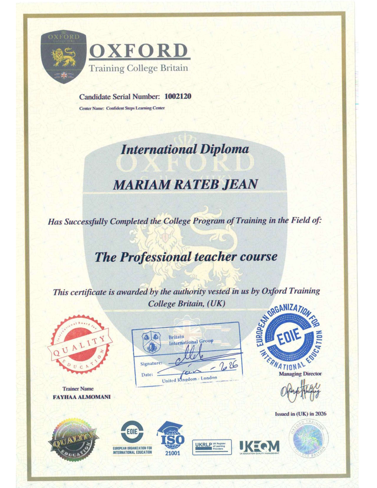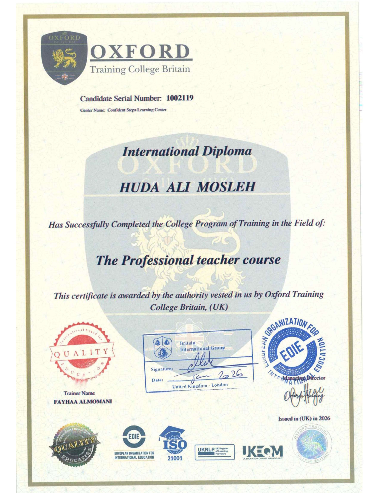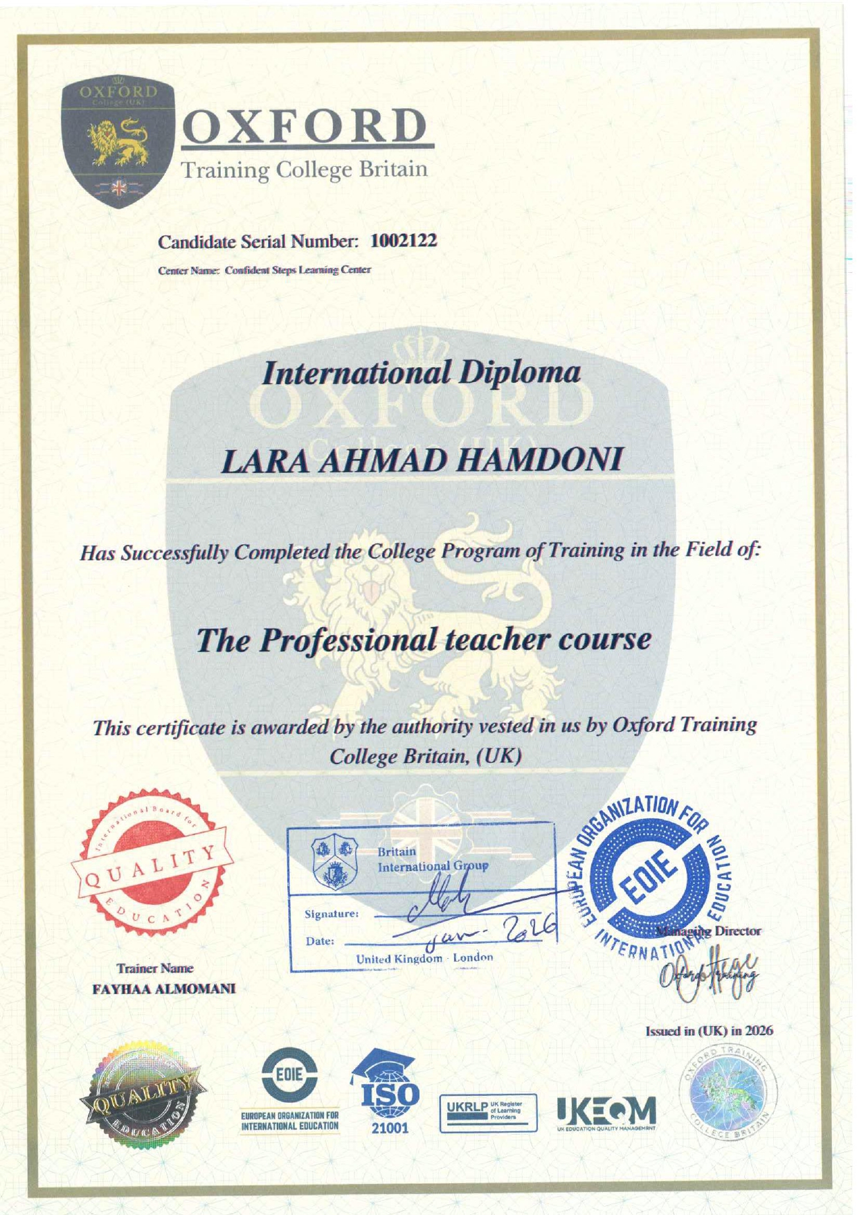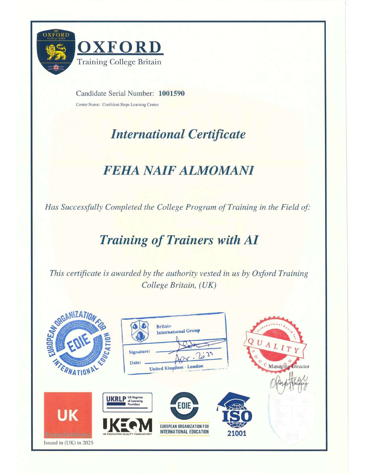 برنامجنا معتمد من معهد اكسفورد البريطاني ويمنحك شهادة دبلوما دولية معتمدة ومصادق عليها من وزارة الخارجية الأردنية
