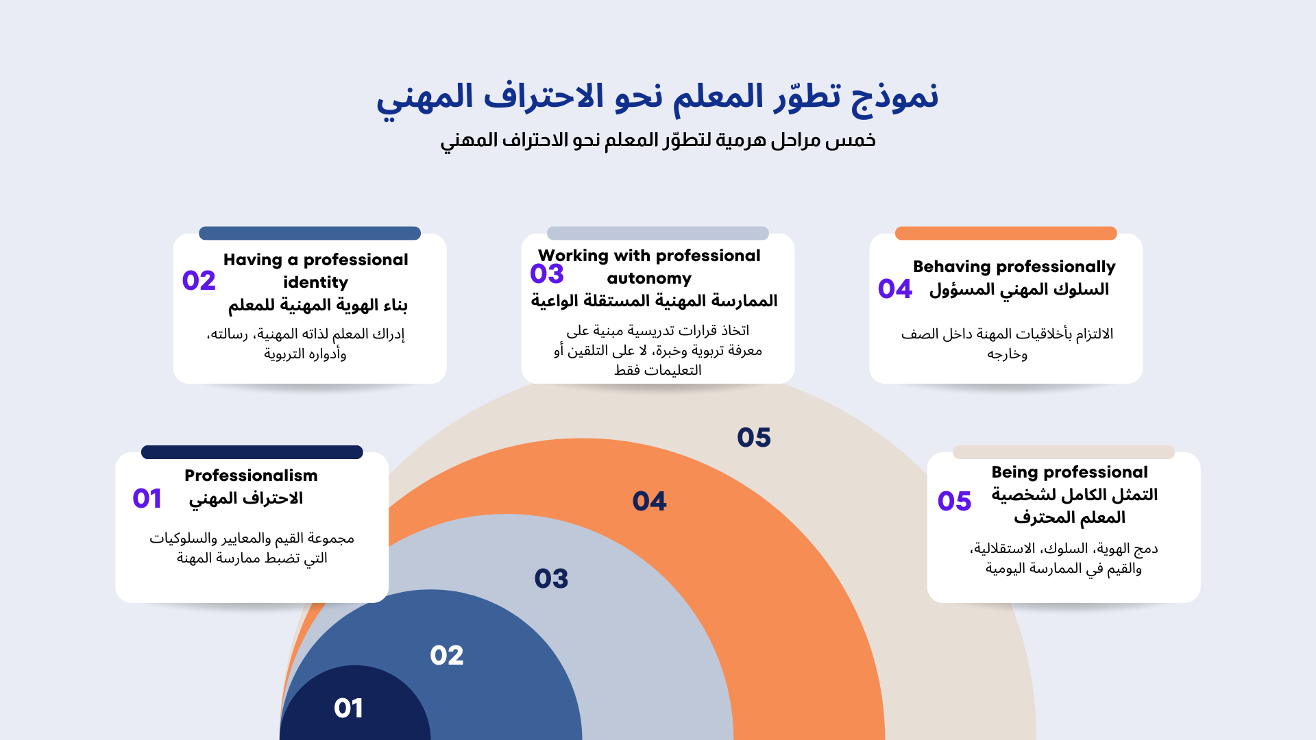 إنه مسار تطوّر واعٍ يبدأ بالقيم، ويتجذر في الهوية المهنية، وينضج عبر الاستقلالية المسؤولة، ويظهر في السلوك اليومي، حتى يصبح جزءًا أصيلًا من شخصية المعلم.