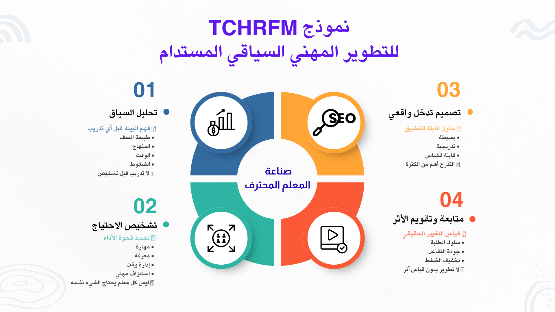 ولهذا تسعى منصة TCHRFM إلى تصميم برامجها انطلاقًا من تحليل واقعي لسياق المعلم، لا من فرض نماذج جاهزة.
